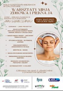 W dniu 20.05.2025 Fundacja Razem dla zdrowia realizator projektu „Misja – Zdrowa i Piękna JA – aktywizacja i integracja społeczna dzięki inicjowaniu, edukowaniu, wspieraniu oraz realizacji działań służących promocji i ochronie zdrowia” przeprowadziła warsztaty dla mieszkanek oraz członkiń Koła Gospodyń Wiejskich z Daleszewa.